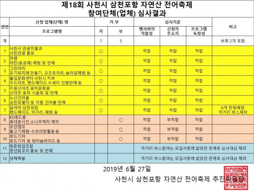 제18회 사천시 삼천포항 자연산 전어축제 참여단체(업체) 심사결과 페이지 정보 작성자 관… 작성일19-06-27 10:42 조회6,251회 관련링크 이전글 다음글 목록 본문 참여단체(업체)에 선정되신 분들께는 사무국에서 별도 연락을 드리도록 하겠습니다. 이전글 다음글 목록