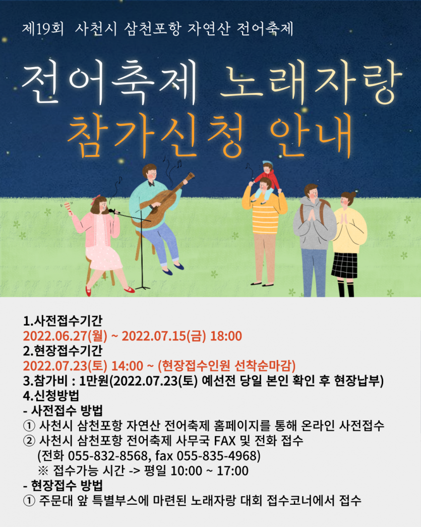 안녕하세요. 오늘 27일부터 7월 15일까지 노래자랑 참가신청 사전접수를 받고있습니다~ 맑은 하늘, 푸른 바다와 함께하는 즐거운 전어축제 노래자랑대회가 7월에 시작되오니 많은 신청 부탁드립니다